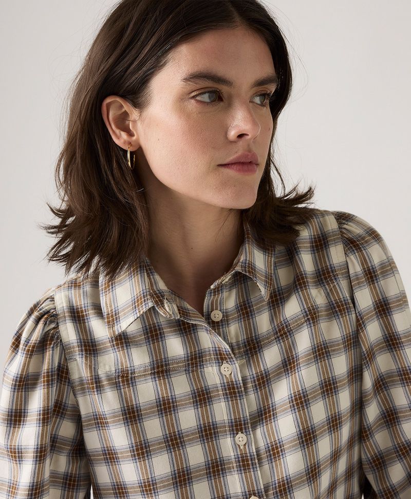 Camisa de espíritu western que tiene detalles románticos como sus puños abullonados, que te cautivarán. Su corte es regular con manga larga y cuello camisero.