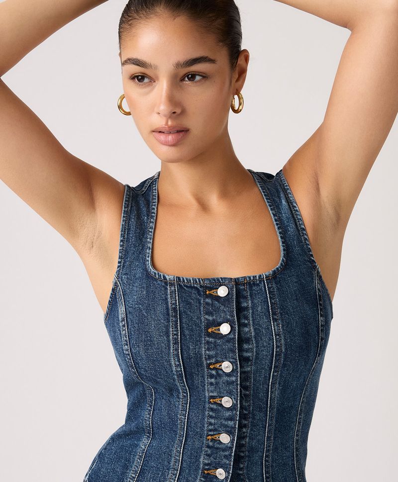 Ajuste y Tamaño Corte ajustado. Sin mangas. Cuello cuadrado. Largo a la cadera. Cierre con botones. Denim stretch 99% algodón, 1% elastano. Tecnología Water<Less®.