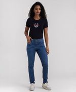 Ajuste y Tamaño Ajustado desde las caderas hasta tobillos. Pierna ajustada recta. Tiro medio, justo sobre la cadera. Estilo moderno y versátil. Lavado medio. Diseño shaping para moldear la figura.