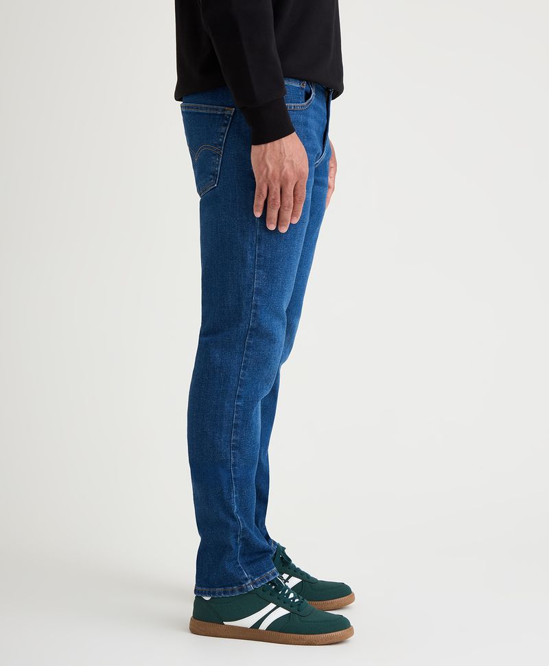 Ajuste y Tamaño Entallado desde la cadera hasta la rodilla. Pierna recta, más estrecha que el straight, más relajada que el skinny. Tiro medio, justo sobre la cadera. Estilo pulido, versátil, moderno. Lavado medio.