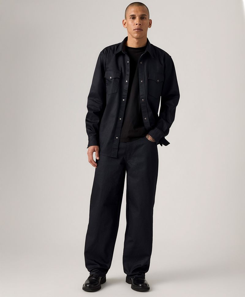 Ajuste y Tamaño Muy amplio en cadera, muslos y piernas. No se entalla en ninguna parte. Pierna extra ancha y suelta en todo el largo. Tiro bajo, debajo de la cintura, cerca de la cadera. Estilo relajado, urbano, con fuerte estética noventera o dosmilera. Lavado oscuro, negro.