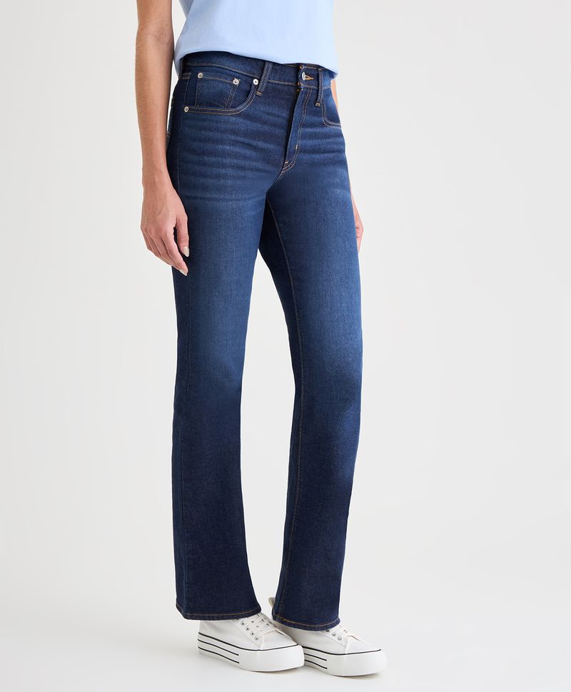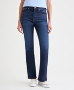 Jeans con corte slim, tiro alto y pierna ligeramente amplia en la parte baja. Es un corte clásico que combina comodidad con una silueta ligeramente estructurada. Funciona muy bien con botas, botines o tacones. Favorece a casi todos los tipos de cuerpo porque equilibra visualmente las proporciones. Están elaborados con una técnica de teñido sin agua.