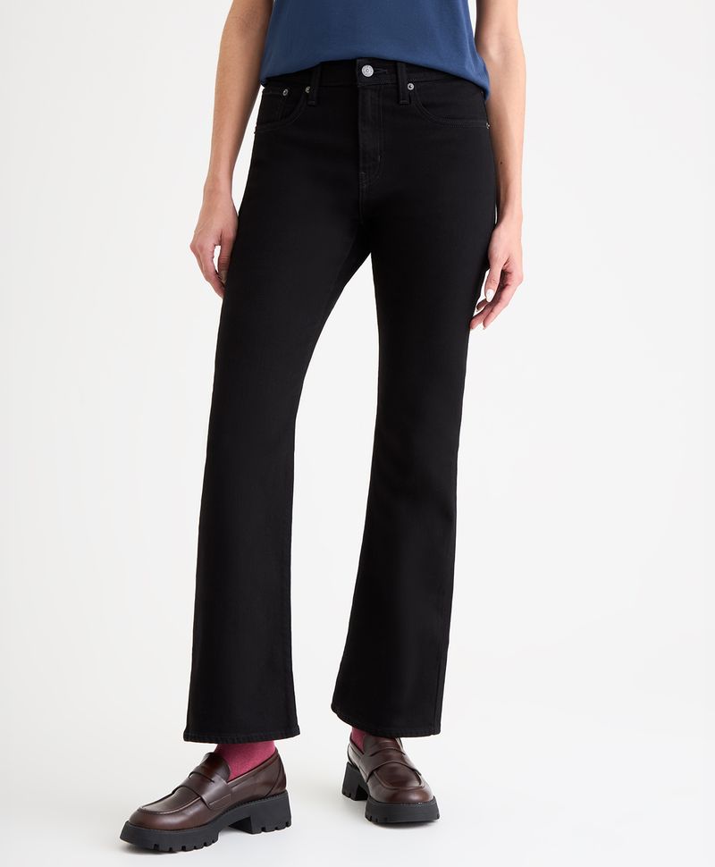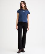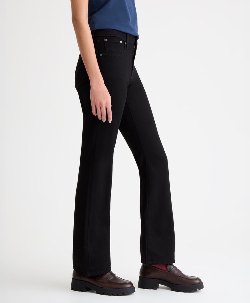Jeans con corte slim, tiro alto y pierna ligeramente amplia en la parte baja. Es un corte clásico que combina comodidad con una silueta ligeramente estructurada. Funciona muy bien con botas, botines o tacones. Favorece a casi todos los tipos de cuerpo porque equilibra visualmente las proporciones. Están elaborados con una técnica de teñido sin agua.