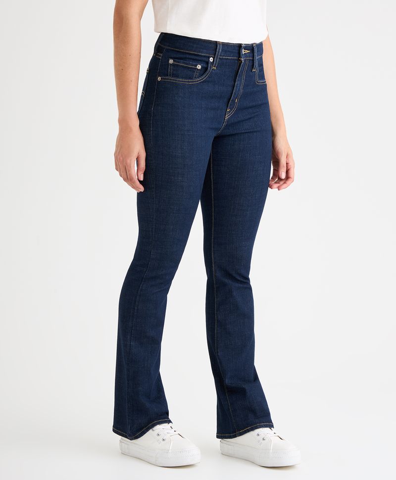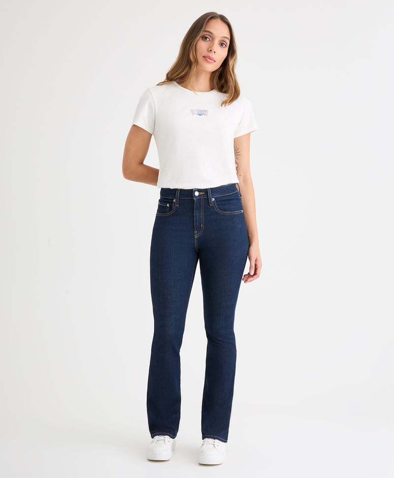 Jeans con corte slim, tiro alto y pierna ligeramente amplia en la parte baja. Es un corte clásico que combina comodidad con una silueta ligeramente estructurada. Funciona muy bien con botas, botines o tacones. Favorece a casi todos los tipos de cuerpo porque equilibra visualmente las proporciones. Están elaborados con una técnica de teñido sin agua.