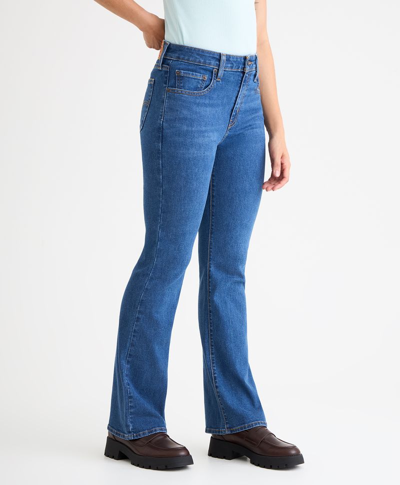 Jeans con corte slim, tiro alto y pierna ligeramente amplia en la parte baja. Es un corte clásico que combina comodidad con una silueta ligeramente estructurada. Funciona muy bien con botas, botines o tacones. Favorece a casi todos los tipos de cuerpo porque equilibra visualmente las proporciones. Están elaborados con una técnica de teñido sin agua.