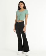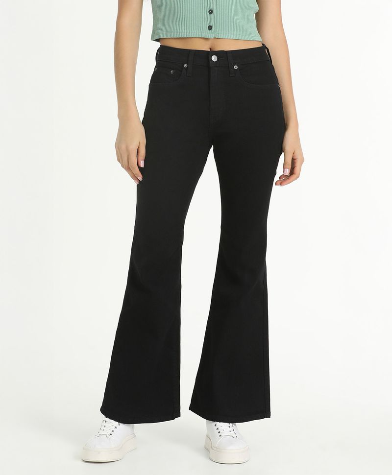 Ajuste y Tamaño entallado en la parte superior y desde la rodilla Pierna acampanada. Tiro alto, encima del ombligo. Estilo femenino, elegante y con un toque vintage. Lavado oscuro, negro.