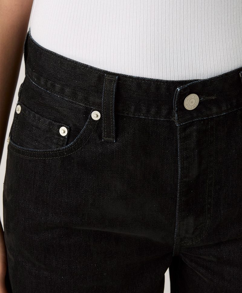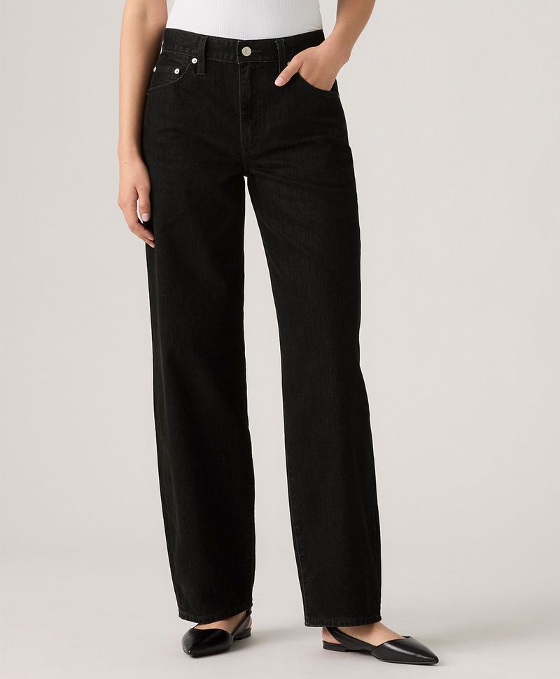 Ajuste y Tamaño Amplio desde la cadera, con volumen en los muslos, rodillas y piernas. Pierna ancha con caída suelta. Tiro medio, justo sobre la cadera. Estilo urbano, relajado y fresco. Lavado oscuro, negro.