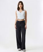 Ajuste y Tamaño Cadera con funcion ajustable y muslos amplios. De mezclilla. Lavado oscuro. Cintura media. Pierna amplia. Denim. Cierre en bragueta.