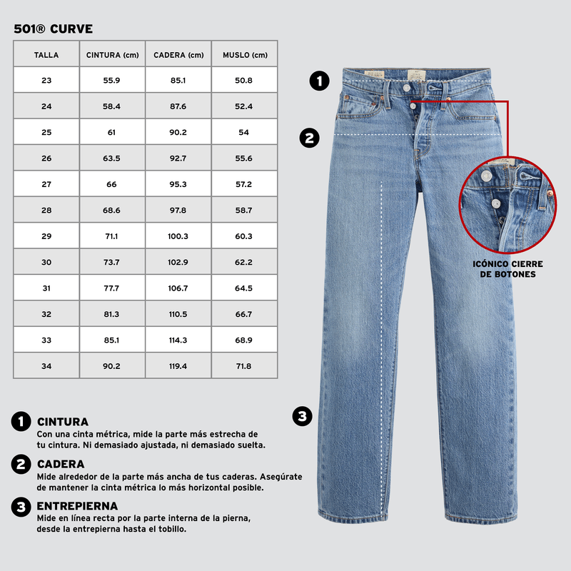 Estos jeans los hicimos inspirados en la perfección de nuestros clásicos 501®, adaptándolos a los cuerpos curvilineos porque se ajusta mejor en la cintura y caderas sin crear espacios. Su corte es ajustado en muslos y cadera, tienen cintura media y pierna recta, en lavado medio. Perfectos para combinar con lo que quieras, camisetas clásicas, blusas delicadas o chaquetas oversize, estos jeans se sienten tan bien como se ven.