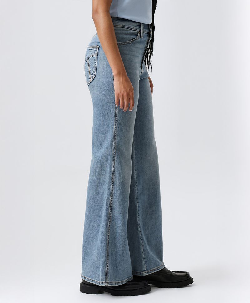 Ajuste y Tamaño Entallado en la parte superior y desde la rodilla Pierna acampanada. Tiro súper alto. Estilo femenino, elegante y con un toque vintage. Lavado claro.