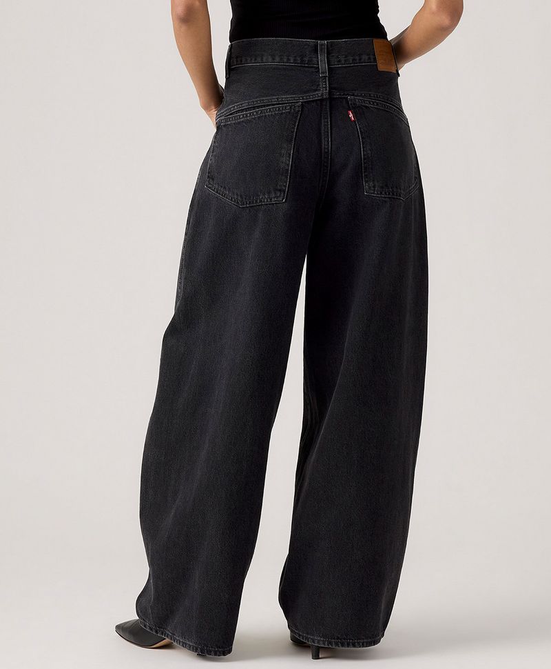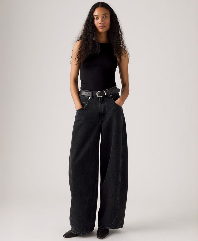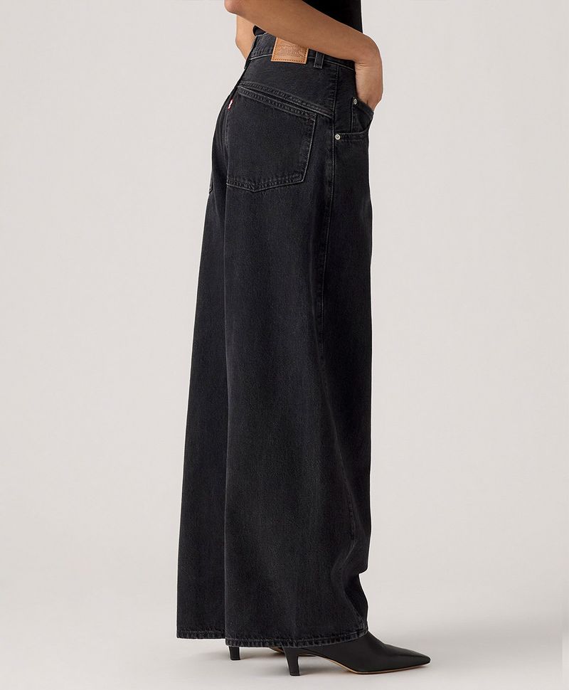 Ajuste y Tamaño Amplio desde la cadera, con volumen en los muslos, rodillas y piernas. Pierna ancha con caída suelta. Tiro medio, justo sobre la cadera. Estilo urbano, relajado y fresco. Lavado oscuro, negro.