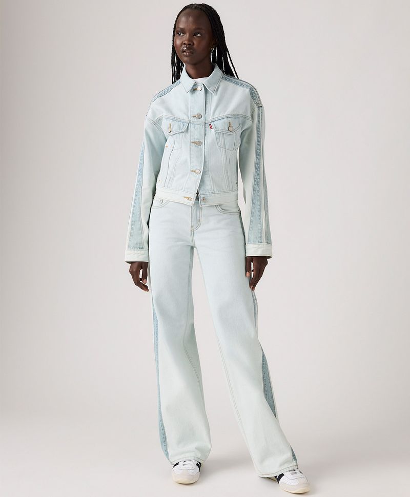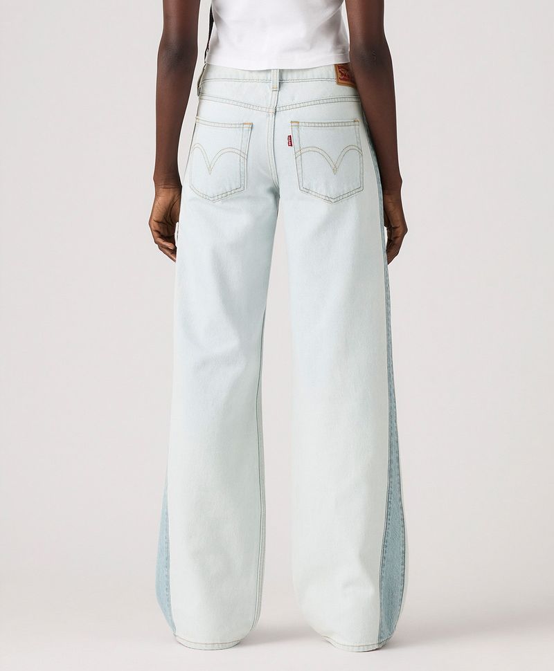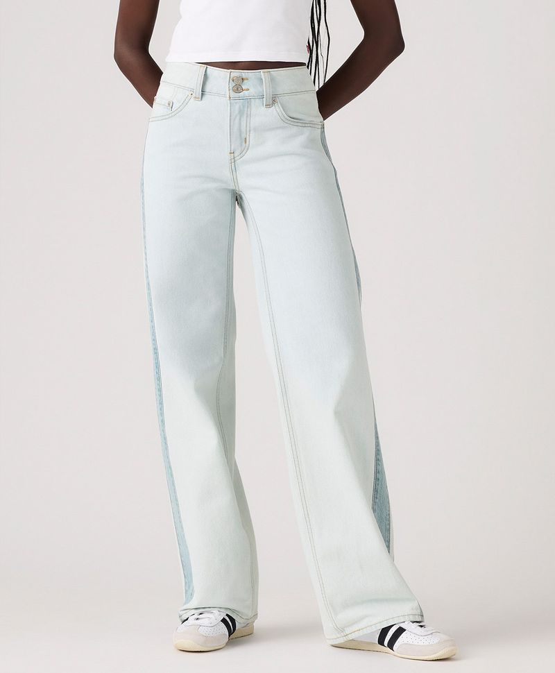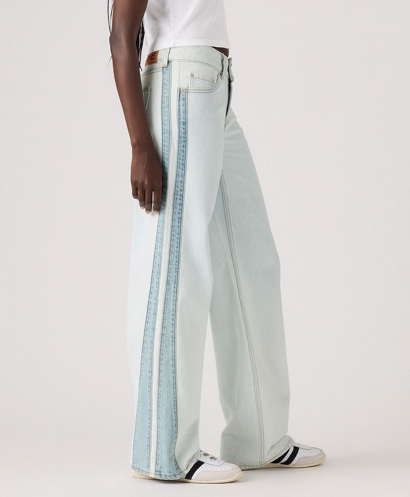 Ajuste y Tamaño Corte suelto. Pierna recta y ancha. Estilo casual, noventero, urbano. Lavado claro. Sesgos laterales en contraste. Tiro bajo.
