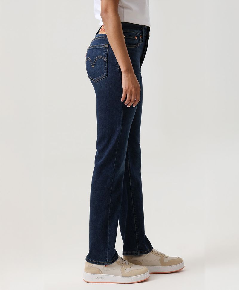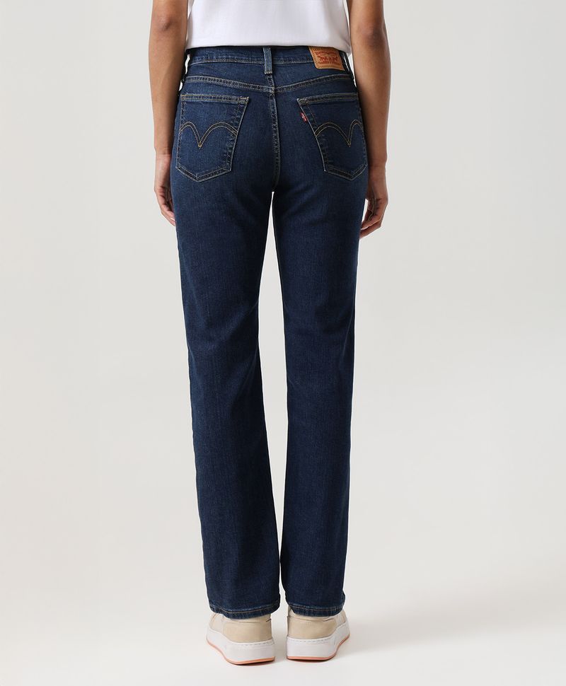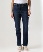 Ajuste y Tamaño Corte regular. Tiro alto. Pierna recta. Lavado oscuro. Tiene ajuste en cintura, cadera y glúteo.