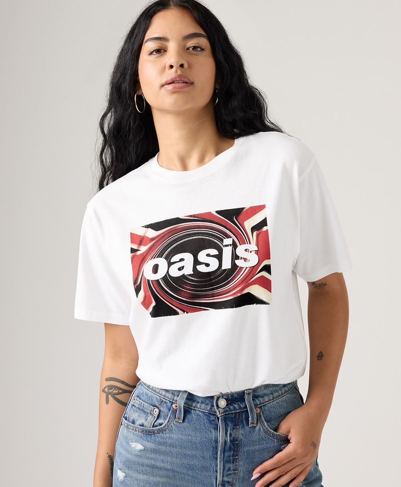 Camiseta unisex de ajuste relajado con cuello redondo clásico y manga corta, creada como homenaje a nuestra música favorita y al legado noventero de Oasis. Incluye gráfico de Oasis al frente, capturando esa actitud brit-rock que la convierte en el complemento perfecto para tus jeans. * Homenaje a Oasis y a la estética retro de los 90. * Ajuste relajado (relaxed fit). * Gráfico frontal de la banda. * Tallaje unisex: para mujeres, se recomienda pedir una talla menos de la habitual.
